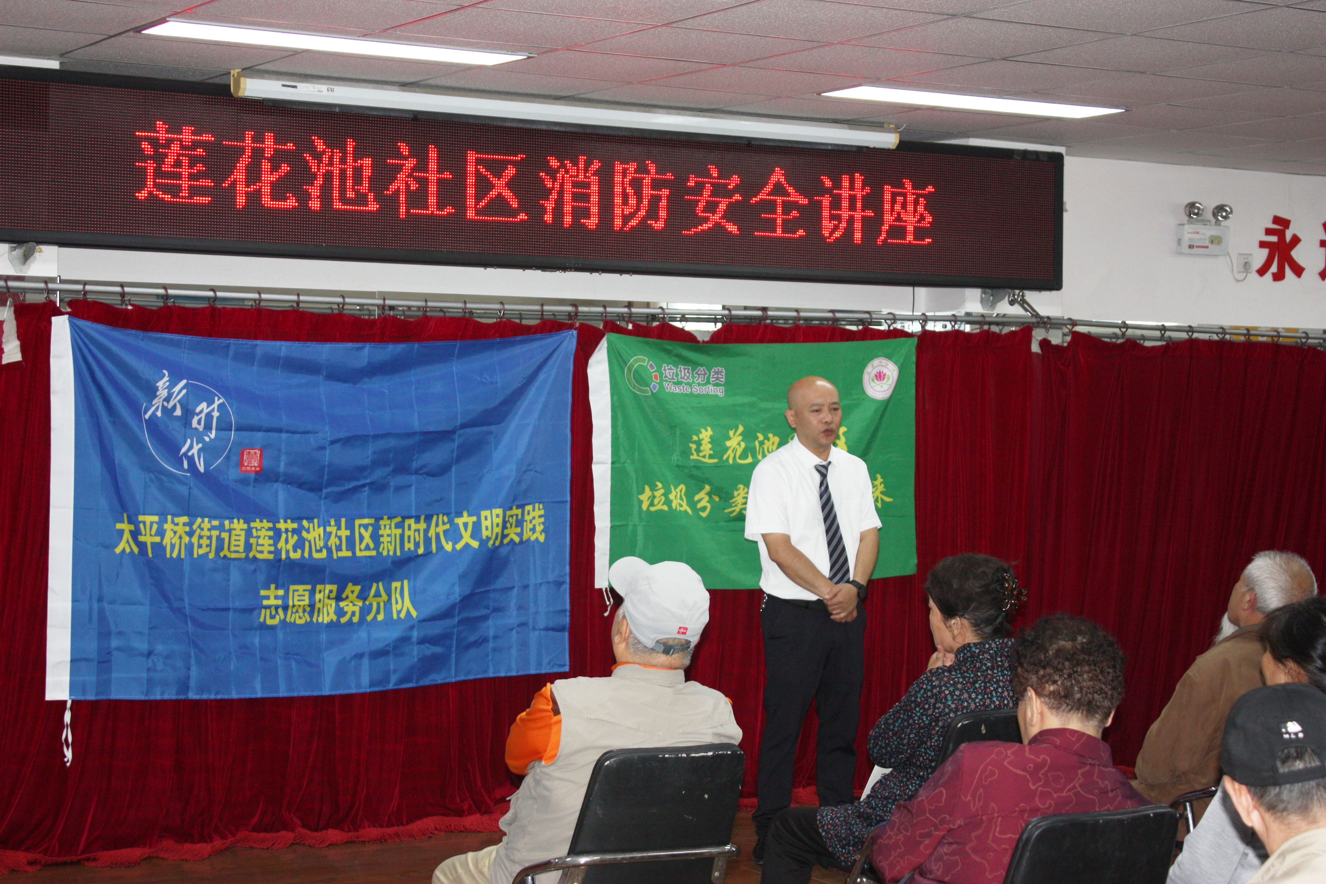 莲花池社区特邀北京中水物业管理有限公司总经理助理杨乃锦对社区居民进行消防安全知识培训。培训中重点提醒住户要如何预防家用电器着火以及出现火情的正确处理方法,正确使用消防器材,发生火灾时要保持冷静,掌握正确的逃生方式。
