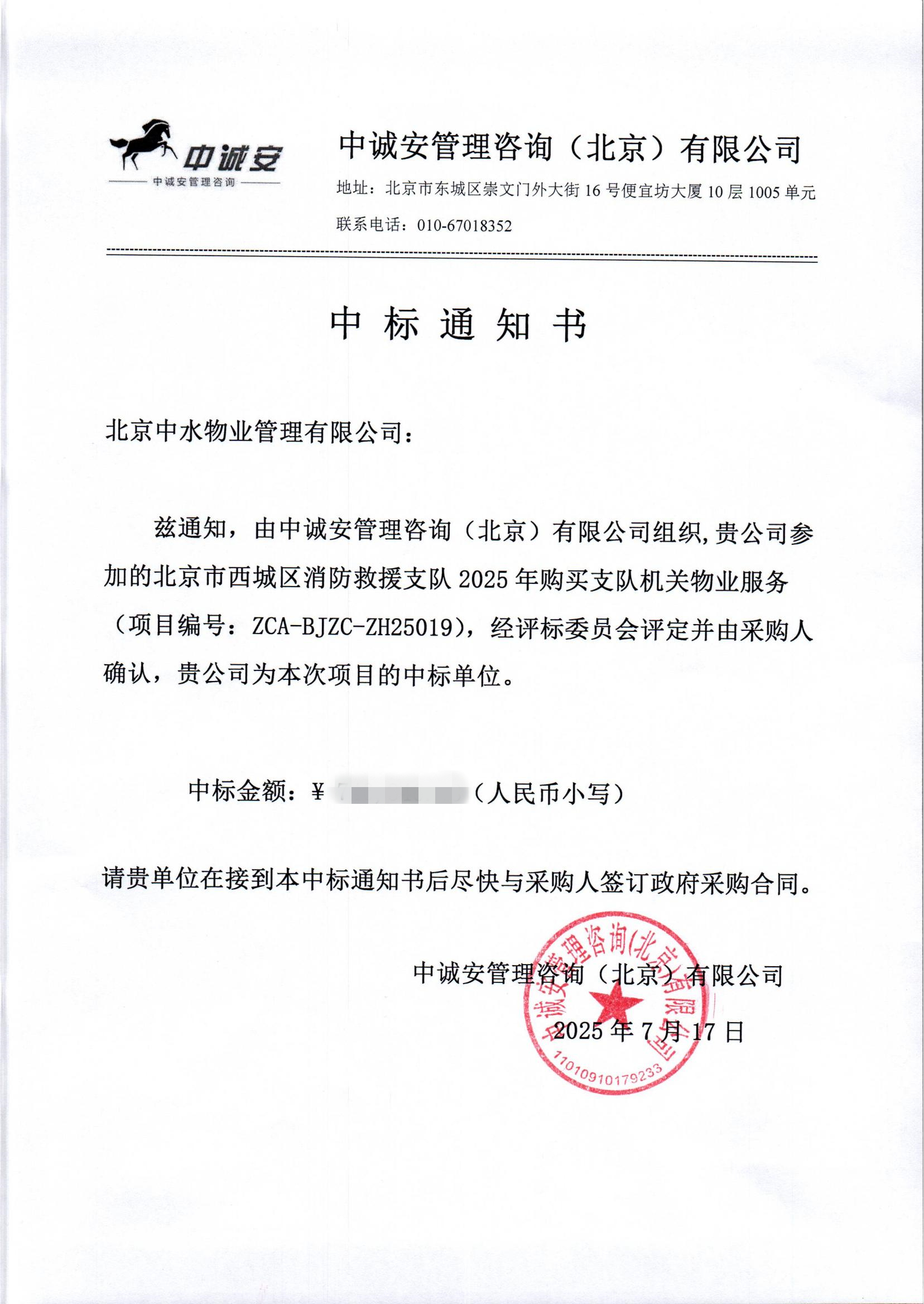 中水物业成功中标北京市西城区消防救援支队2025年购买支队机关物业服务项目