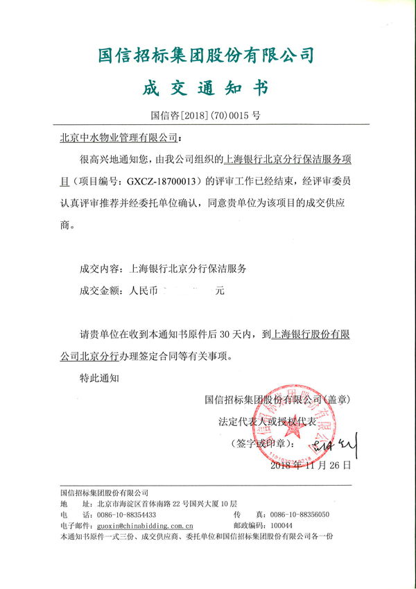 上海银行北京分行保洁服务项目成功中标