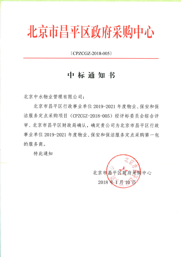 北京市昌平区行政事业单位2019-2021年度物业、保安和保洁服务定点采购项目成功中标