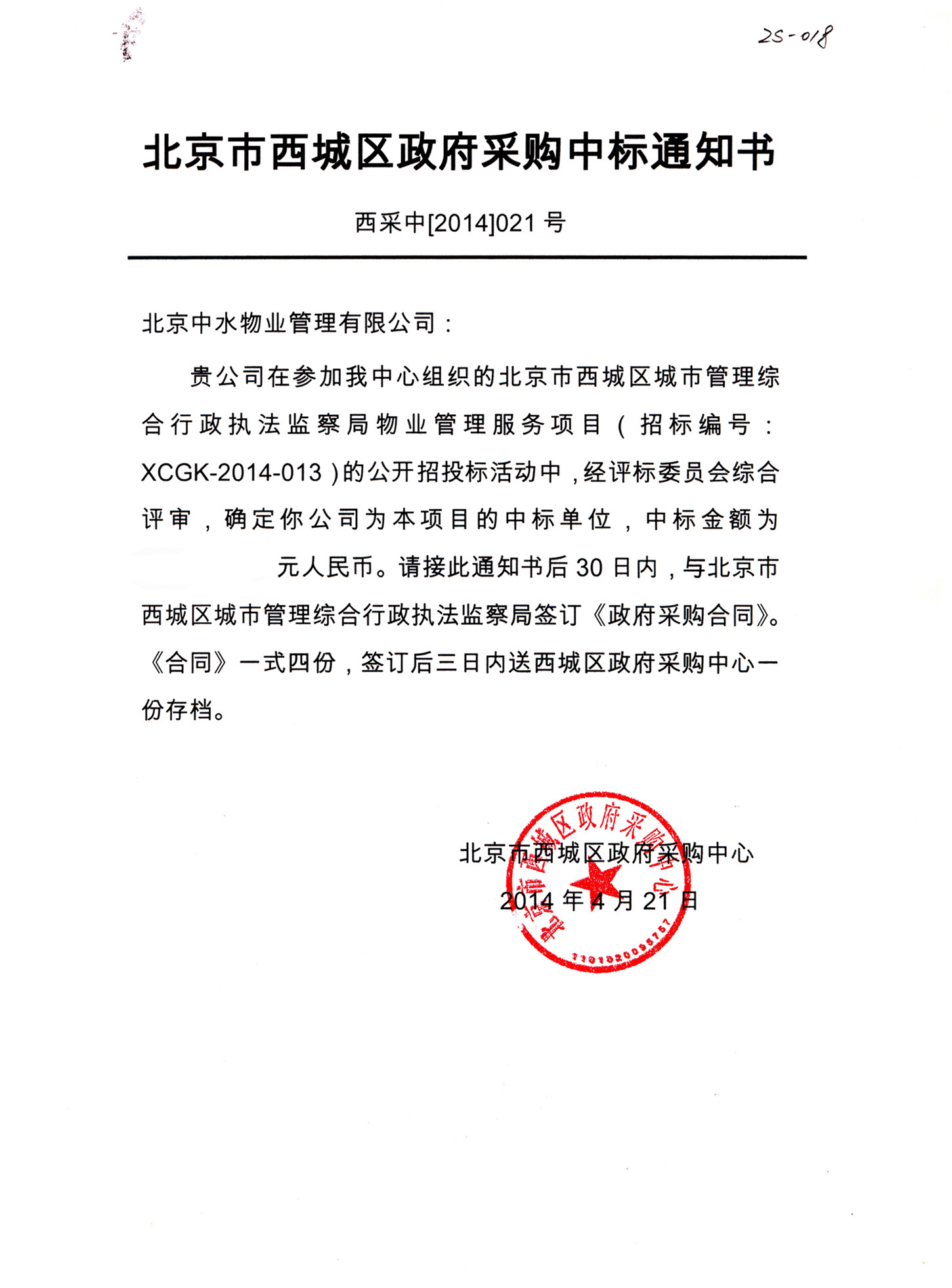 北京市西城区城市管理综合行政执法监察局物业管理服务项目成功中标