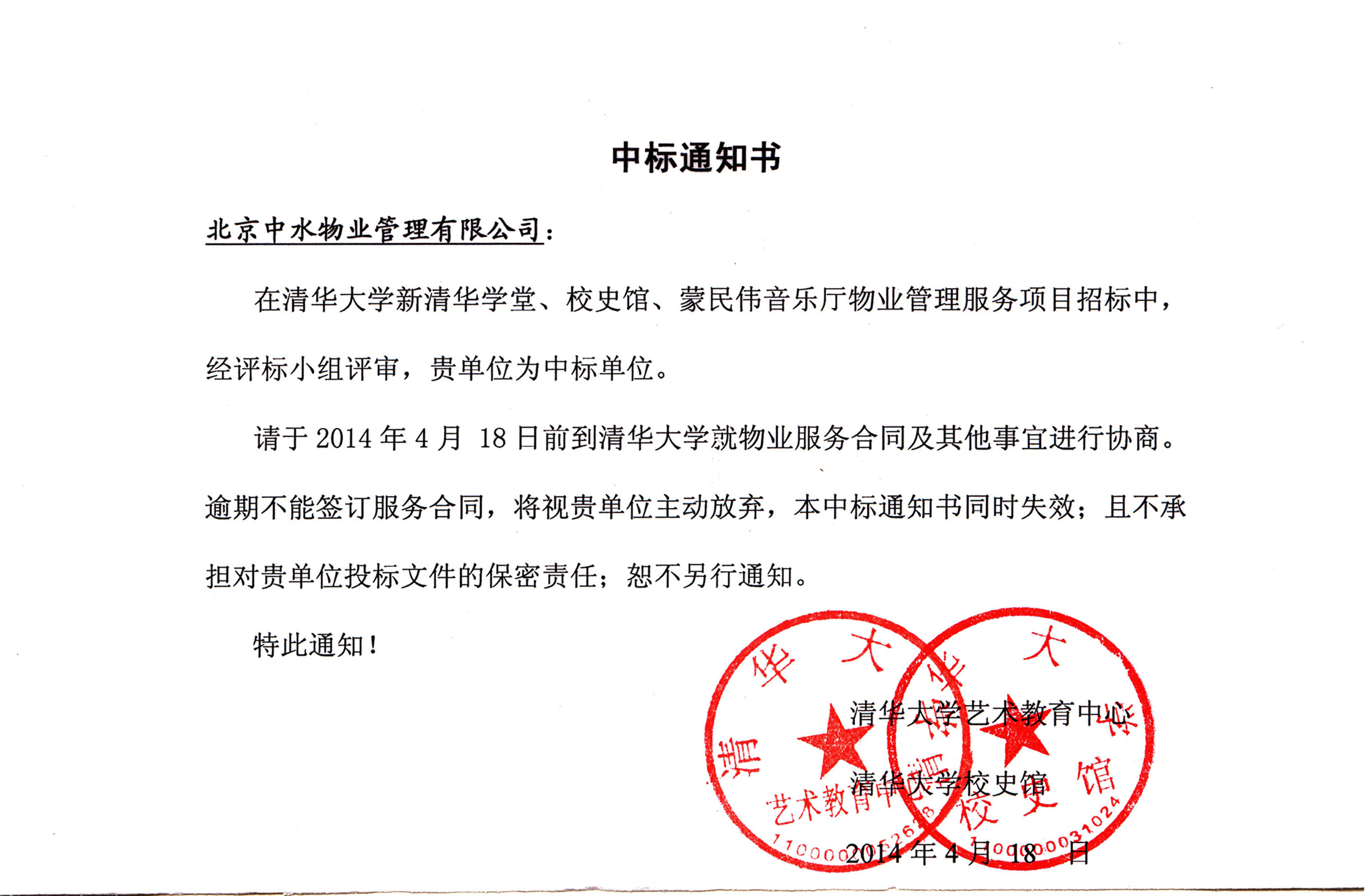 喜讯:2014年4月29日我公司成功接管清华大学新清华学堂、校史馆、蒙民伟音乐厅物业服务项目
