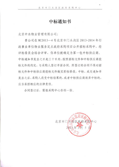 成功入围北京市门头沟区2013-2014年度行政事业单位物业服务定点供应商