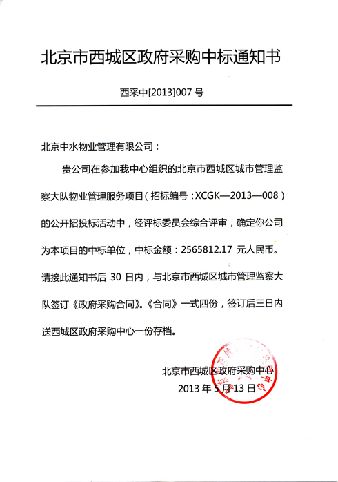 北京市西城区城市管理监察大队物业管理服务项目成功中标